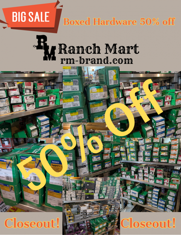 | BIG SALE! Closeout of lots of hardware and more. Over 3 tons of hardware in stock. Contractors take a look. Save in store at Ranch Mart located at 120 Eagle Rd Wickliffe, KY or online. Not all hardware is on the website. Check it out at rm-brand.com Catch the live stream on The Ranch Mart Facebook page, on the website or on the Ranch Mart app every Tuesday at 6pm and Thursday at 6:30pm |