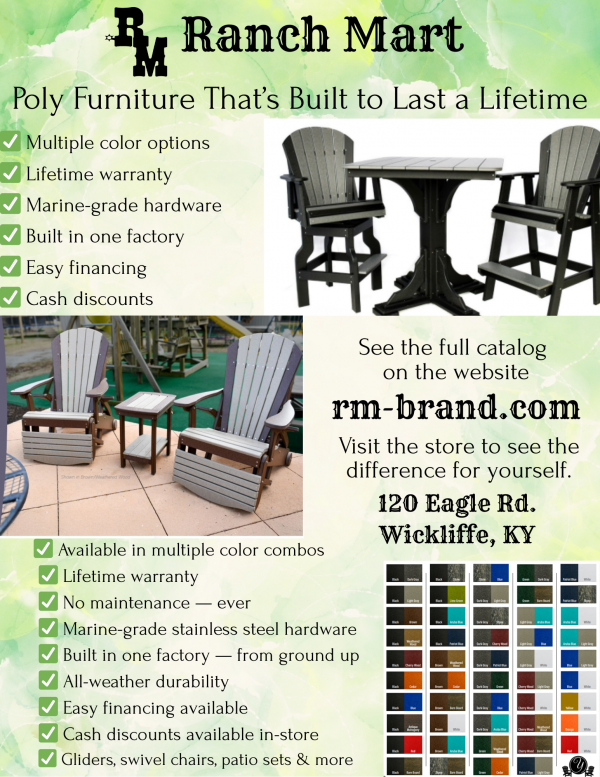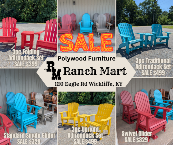 | Outdoor Living, Built to Last – Shop Our Poly Furniture Collection! Turn your porch, patio, or backyard into a cozy retreat with our durable, low-maintenance poly furniture—crafted to handle the elements and still look stunning season after season. Whether you're hosting a backyard BBQ or just sipping sweet tea in the shade, this furniture brings comfort, color, and country charm to any outdoor space. Made from recycled materials and built to resist fading, cracking, and splinters, it’s the perfect mix of eco-friendly and worry-free. Choose from rockers, swings, Adirondack chairs, tables, and more—all made to match your lifestyle. We offer the area's best selection! Check out or entire line online by visiting rm-brand.com and click Poly Furniture. Stop in and check out our current inventory at Ranch Mart located at 120 Eagle Rd. Wickliffe, KY. |