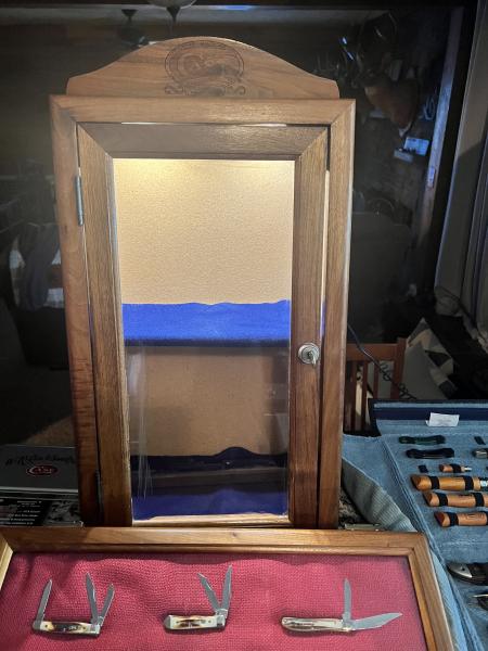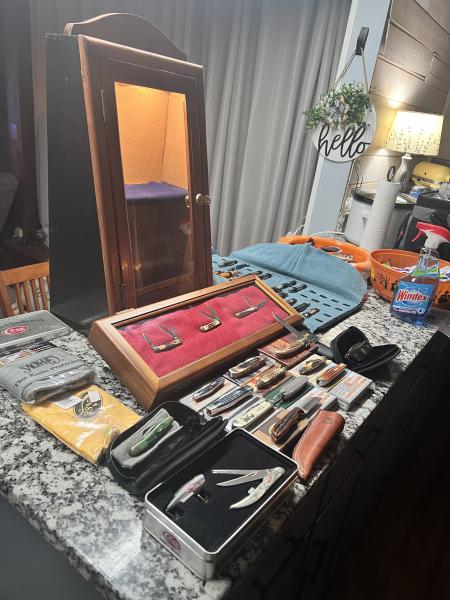 | Up for sale or trade for long gun on carry pistol is a great bunch of new never carried mostly Case knives there is a few older knives in the lot includes old case knife store display case very nice condition with key and the other wooden display case goes with the lot also. There is about 34-37 knives in the bunch like to sell the whole lot or trade. Make offer text 270-704-2471 thanks |