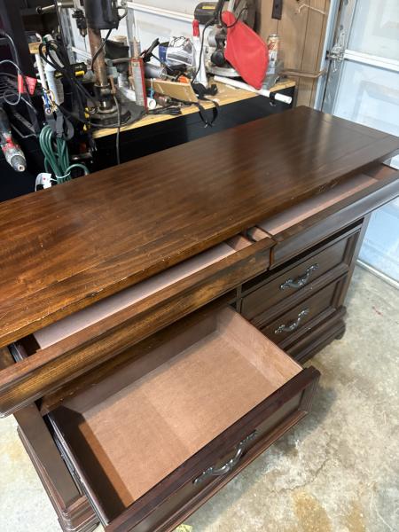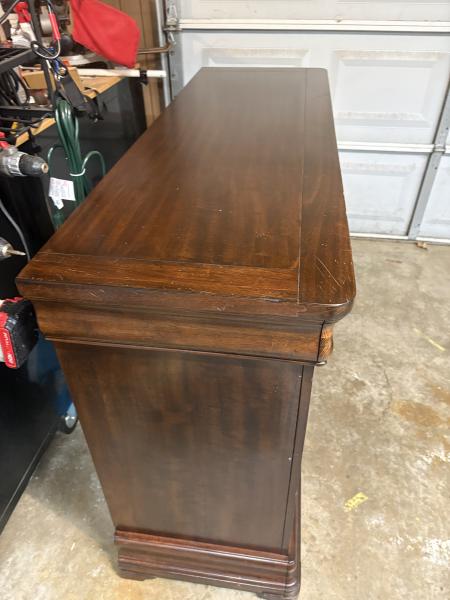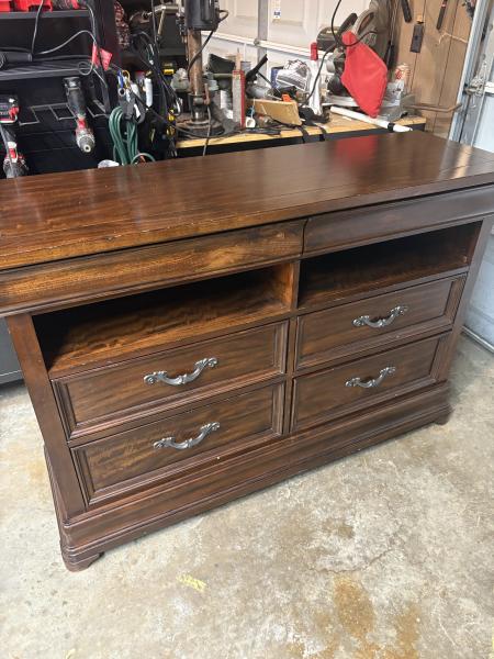 | 58" wide by 19" deep by 40" tall. This is a heavy and well built piece of furniture that we used as a tv stand for a while. Has 4 deep drawers and 2 felt lined drawers on top. Has some small nics here and there but still looks very nice. It is well built and will last you a very long time. I am asking $100 obo for it. Call or text if you are interested 270twotwosix-five 008 Thank you! |