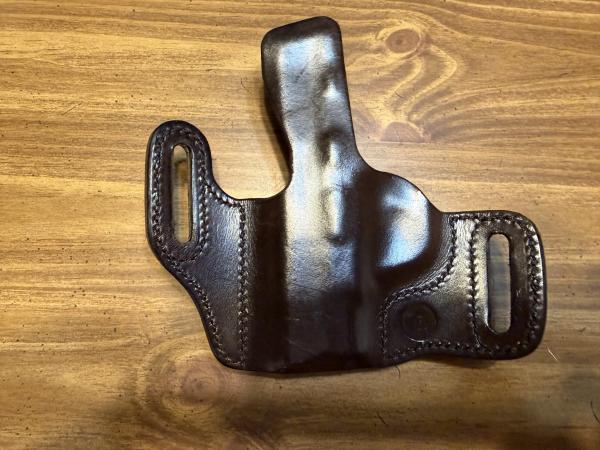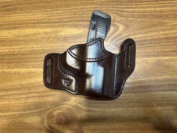 | PREMIUM LEATHER OWB HOLSTER FROM WRIGHTS LEATHER WORKS FOR THE SMITH AND WESSON M&P SHIELD. COLOR IS COFFEE. THESE ARE SUPER NICE MADE TO ORDER LEATHER HOLSTERS THAT ARE QUITE EXPENSIVE NEW. |