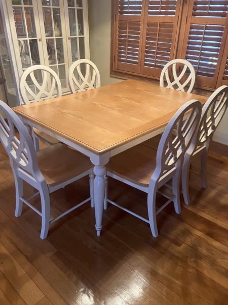 | Beautiful Dining Room table/Chairs and Hutch- also have 2 bar stools that match the chairs Table measures 60 x 42 without leaf Hutch measures 79 x 48 x 14 Message me if interested- 270-705-2421 |