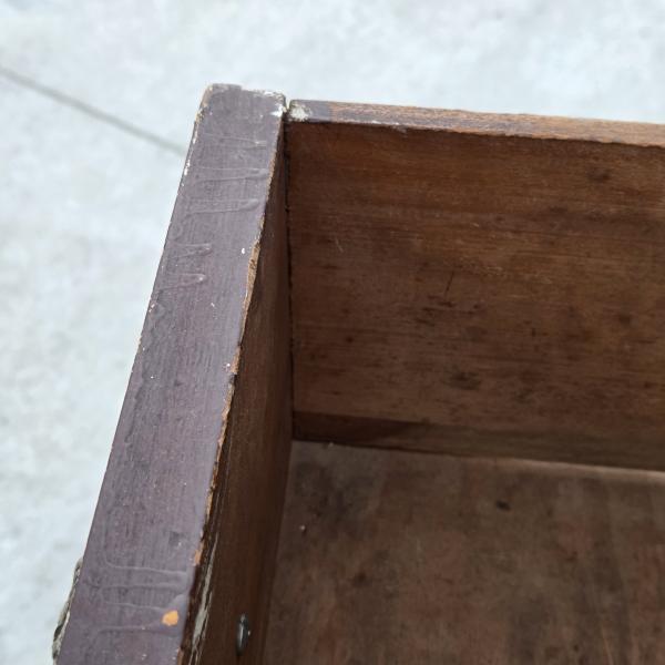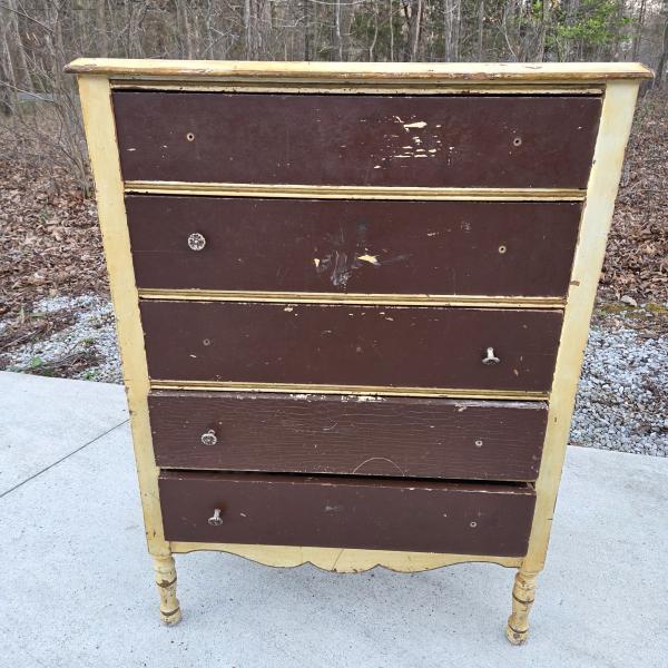 | Condition: Used / vintage Material: Solid wood Drawers: 5 Style: Farmhouse / cottage / shabby chic Color: Brown with yellow frame (distressed) Hardware: Mixed knobs (some missing) 5 functional drawers for storage Solid wood construction Turned front legs and decorative apron Compact size — good for bedroom, guest room, or entryway Shows cosmetic wear from age and use Some knobs missing / mismatched Could be restored, repainted, or used as is |