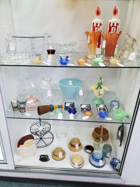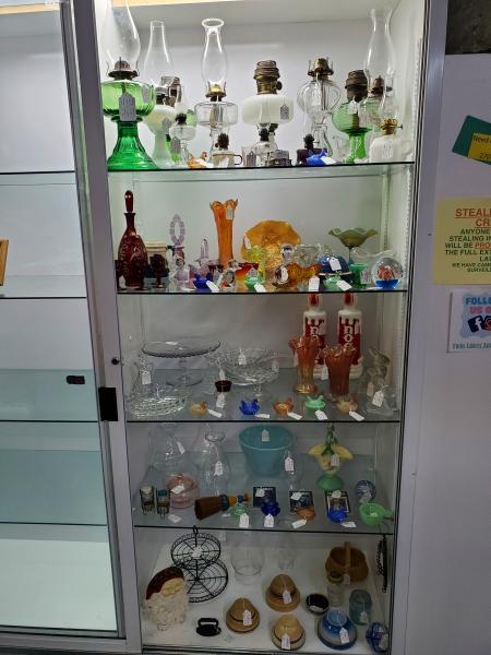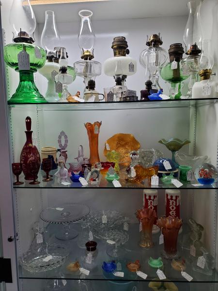 More antique glass, stoneware, lamps, graniteware, paperweights, oil lamp chimneys, etc. in the showcase, see pictures below.