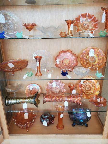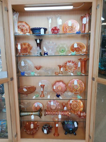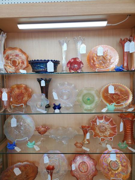 A showcase of Quality Antique Carnival Glass, at McKenzie Antique Mall, McKenzie, Tennessee.