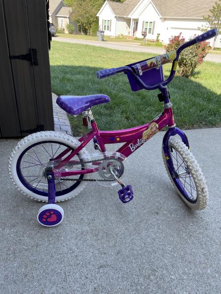 Girls barely used Barbie Bicycle (with training wheels).  Wheels are 16" and the white tires have none of the factory rubber studs worn off. The pink bike has probably only been ridden three times and is just like new (no scrathces, blemishes or defects).  It would make a great Christmas present.  $40.  Call 270-556-0424 for further information or to arrange pick up.  Bike is located in West Paducah, Ky,