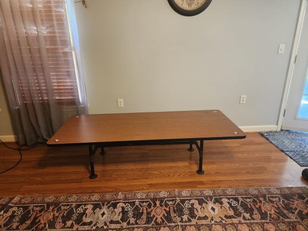 Coffee table with reversible top gray on one side wood grain on the other. The table is 72"long and 30" wide. It has industrial style leg frame