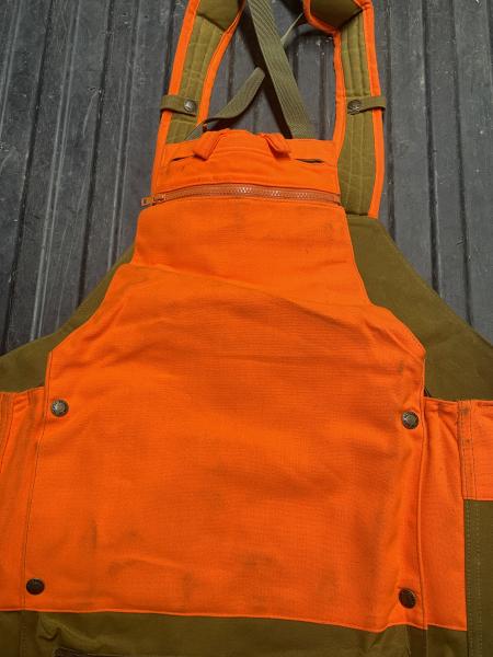 As new, unused Filson Guide Upland Vest. Vest is tan and hunter orange. A very durable and heavy duty vest with multiple pockets and connection points for electronic tracking devices and other equipment. The vest features an internal adjustable belt system to reduce weight on the shoulders. Regular size but the vest is adjustable for length and width