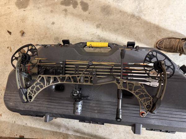 Mathew’s v3 27 , 70 pounds with a 28” draw . Matthew’s stabilizer , 6 arrow quiver with a spot hog sight bar with ultra view 2 pin sight . New strings .
