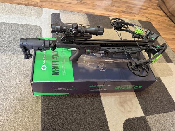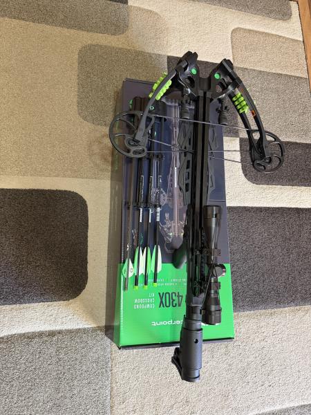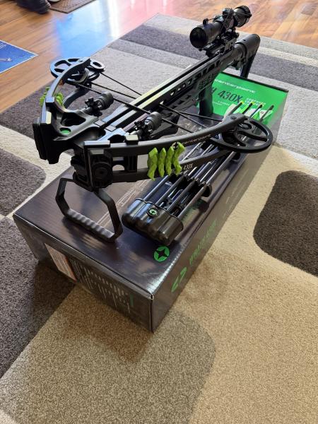 Bought new. Shot probably 25 times. Comes with several bolts and 3 G5 mega meat broadheads, rope cocker, tru glo scope and factory scope.