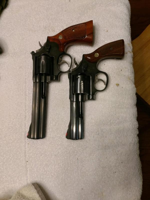 S&w model 686, blackened ss, these are factory done,I will separate, there not matching numbers,one is 4inch the other is 6 inch,there pretty rare ,I might be wrong on this but I think the internet said 4500 was made of the 6 inch,maybe the same on the 4,900 for the 4inch 1200 for the 6inch,will take less if someone bought both ,12709702132
