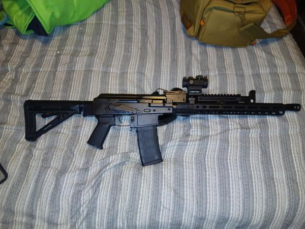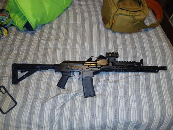 PSA AK556 200 rnds max ever fired. Not a scratch except the usual the AK safety lever. Aluminum foregrip, ajustable stock, iron sites, Romeo msr optic and one 30 rnd mag. Bought new shot it once installed SIG RomeoMSR optic broke my back soon after because of injury cannot shoot it. Hasnt been fired since optic was installed. Hell of a deal for a damn fine weapon. When i say like new I mean like new. $1250 firm.