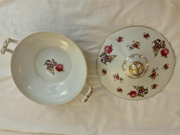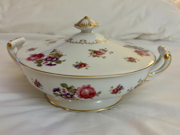 Vintage Sango porcelain covered vegetable bowl. Floradel pattern.