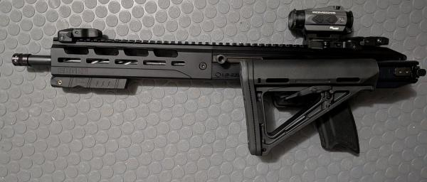 For sale is a very good condition Ruger 5.7 LC Carbine. Has a 16.1 threaded barrel, folding and telescoping stock, Ruger flip up sights, two Ruger 20 round mags, and a green laser. The optic is not included. No box or manual. Factory Ruger buttstock was replaced with a Magpul one.