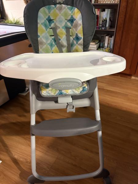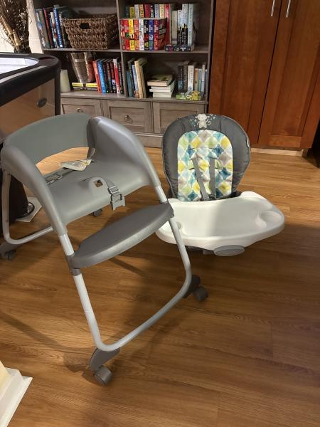 The base has wheels on it. And chair lifts out to use base as booster scooted up to table. Or use seat as infant seat. The back reclines on the seat. Great used condition. 30$. 270-519-0239