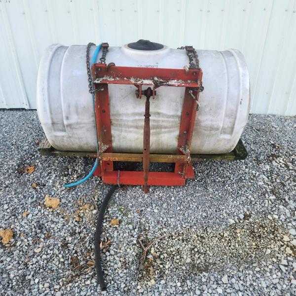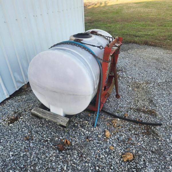 200 gallon plastic tank mounted on 3-point carryall. Roller pump runs from PTO. I used this for a few years to water garde before we got city water.  Filled the tank from a pond.