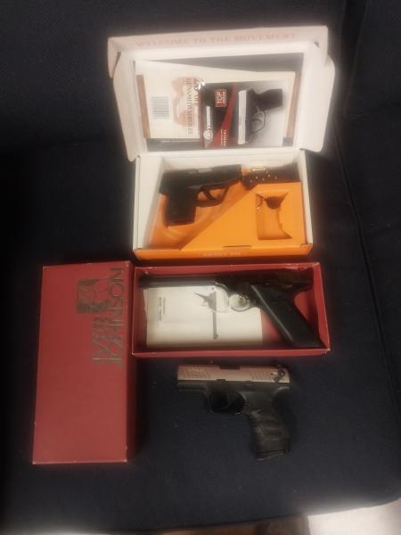 1st-1960 REMINGTON 870 WINGMASTER,16 GAUGE 28INCH FULL CHOKE,PLAIN BARREL,SILVER TONGUE‐-700.00. 2ND--REMINGTON 722 222 REM.26 IN.BARREL,METAL BUTTPLATE Original finish,nice scope,,-650.00. 3rd--STEVENS 311A,DOUBLE BARREL 410 GA,,NICE GUN LOCKS UP TIGHT - 800.00. 4TH-- RUGER 50TH ANNIVERSARY MUDDY GIRL ADJUSTIBLE STOCK,MAG STORAGE ON STOCK-450.00. 5TH--RUGER 10-22 AR SETUP,SCOPE,RED DOT LIKE NEW 550.00,,6TH--TAURUS 380 IN BOX -250.00. 7TH--IVER JOHNSON TRAILSMAN IN BOX LIKE NEW-425.00. 8th--walther p-22--250.00. All function as new trades considered. TEXT-270-207-1498. AMO AVAILABLE. PICS COMING. NO 12 GAUGE SHOTGUNS ON TRADE. NO AR,S,,