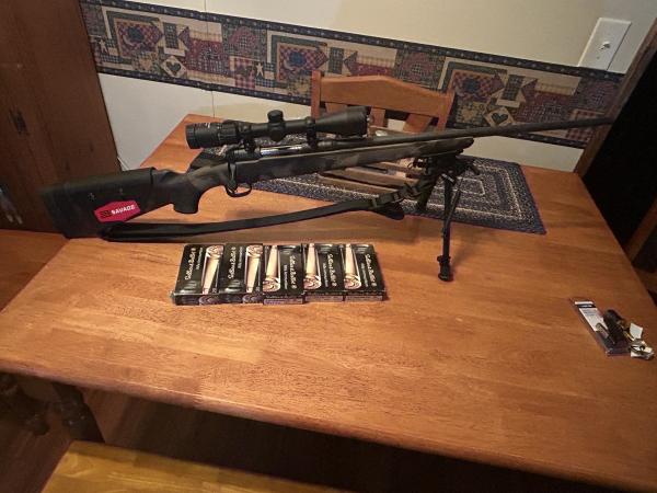 Savage model 11 6.5cm with 3x9x40 sig scope, bipod, sling, and 5 boxes of ammo. $500.00