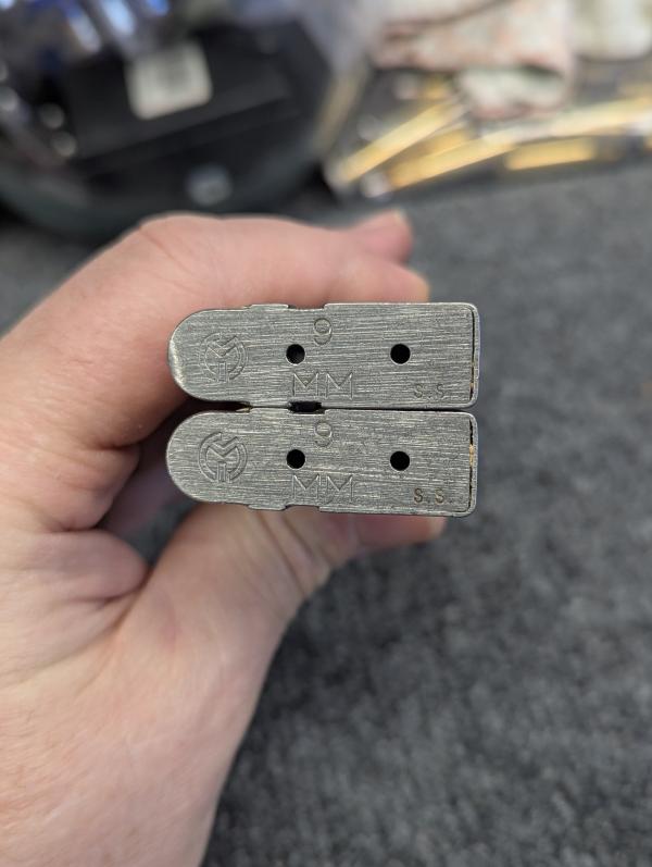 Here I have two Colt brand 1911 9 mm magazines. Both are stainless steel and I don't think they've ever been used. They're in immaculate condition. Springs are nice and tight. No rust, no scarring, no slide marks. Asking $35 for the pair. Save big money. Contact David at 502-303-7574