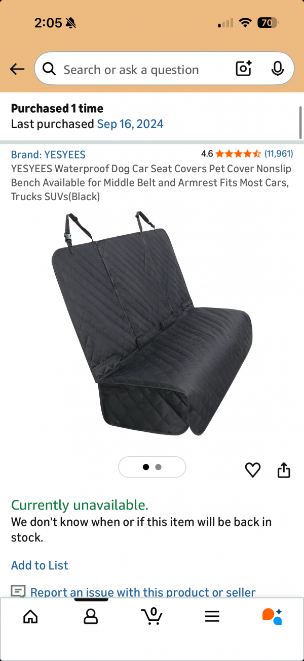 2) Rear seat cover (waterproof, we used under car seats but would be great for pets or general protection as well) - $30