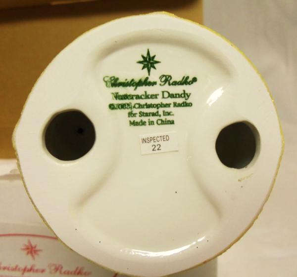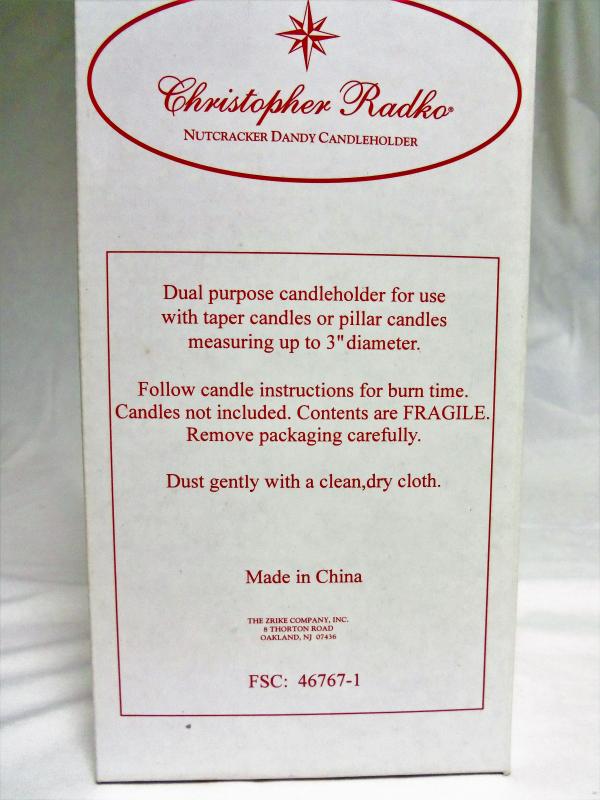 Christopher Radko “Nutcracker Dandy” candleholder.  Mint in box with original packaging materials but has been opened to be inspected and be photographed.  Basically new.  Difficult to read, the print was blurred in the manufacturing process, but it appears to be 2003.