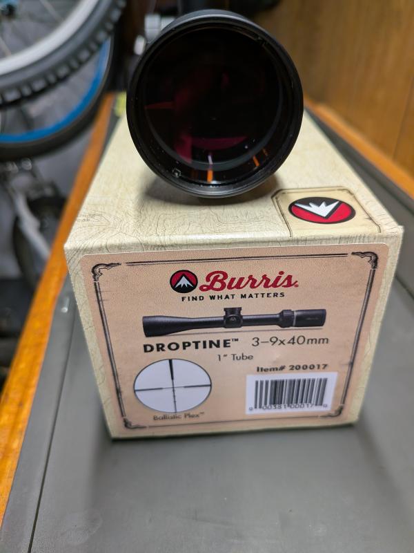 Burris Droptine 3-9x40 scope with Ballistic Plex reticle and Warne Vapor picatinny rings, like new condition, used only on a single shot 5.7 rifle so hasn't been exposed to any real recoil. Comes with box and manual and a neoprene cover.