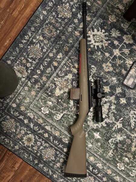 Ruger American Ranch Gen 1 in 5.56 Nato with a monstrum 1-4x scope and an optional QD muzzle brake for Dead Air suppressor mounts. Cost without muzzle brake $425 cost with muzzle brake $525 with come with another muzzle device if the DA one is not wanted.