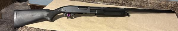 2 3/4 or 3 inch 12 gauge with extended turkey choke. Does have a small hole in the bottom of the pistol grip where someone put a sling stud.