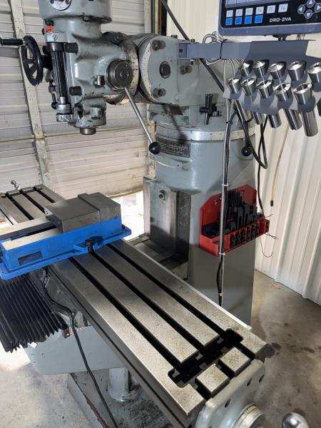 For sale sharp milling machine in great shape.  Original paint later model machine.  Has 9x48” table, sharp power feed on x axis, dro with lcd screen for doing circles and patterns on x and y axis, new vise, new set of collets, and set of new hold downs.  Has 3hp power currently set up on 240v 3 phase but can add a converter to 240v single phase for extra 150.00.  Chrome harden ways, 1 shot oiler.Machine is tight and quiet head.  Has Kurt air draw bar for changing the collets easier.  Has built in coolant tank and place to put a coolant pump.  Won’t find a better one used.  Located in mayfield ky I can load with forklift and can be seen under power.  Call text 270 nine seven zero 0717