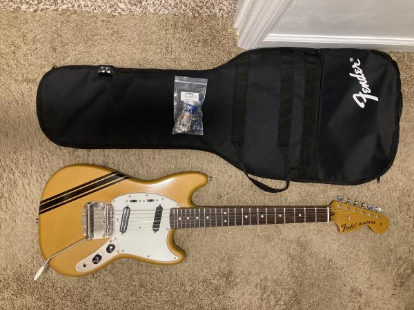 For sale is : Mustang with gigbag. Metallic gold with railbucker bridge pickup with coil splitting push/push tone pot. Guitar started as a Squier Classic vibe Mustang and was converted to a 60’s Fender style appearance. Sounds and plays great with lots of tone 7.4 lbs. $475 . Next is a JS11 Jackson with gold hardware and pickup upgrade. It plays and sounds amazing, comes with gigbag, 7.2 lbs. $150 . Last is a telecaster body 4.4 lbs. Walnut color with double black binding, $75. Gears is at Ft.Campbell area. Sixwonfive forwonfive ninesixwonwon . Thanks!