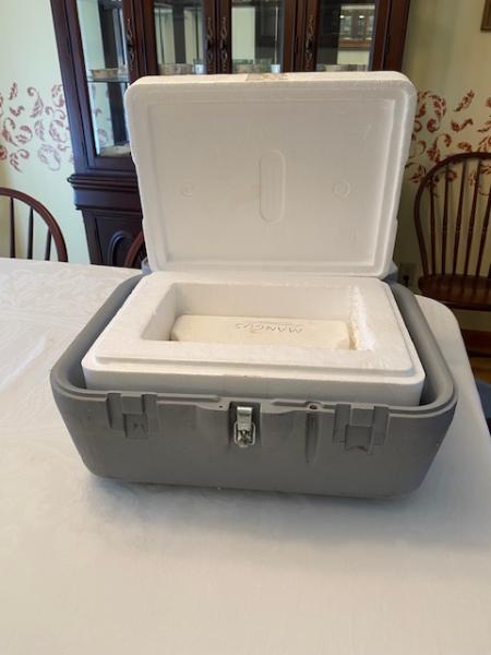 This is a great horse semen shipper - molded plastic - sturdier than the cardboard ones but not as expensive as an Equitainer!  When we were breeding our mares this was our back-up shipper so lightly used.  Measures 10 x 14 x 18.  Includes styrofoam liner, styrofoam semen container and cooling brick (currently in freezer!).  We had NO troubles using these shippers even when FedEx lost it in their warehouse once for 24 hours - mare still conceived.  Horses sold so don't need it anymore.  Cash only please.