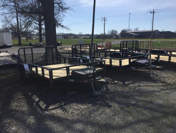 New 82”x12’ Utility, 3500lb axle, 4” channel, toolbox, dove, 3’gate w/ spring helpers, powder coated, pressure treated wood, LED lights, radial tires on 15” rims. Tie downs all around, 2” ball hitch.