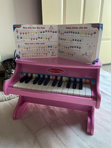 Cute Melissa & Doug pink toy piano. Has a music book with songs like "Row, Row, Row Your Boat" and "Twinkle, Twinkle, Little Star". Keys labeled with letters, helps kids learn. Fun for little musicians! Pick up in Reidland. Cash only. No holds. If it’s listed it’s available.
