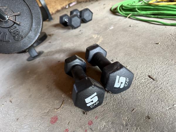 Also includes 2-5lb and 2-10lb dumbbells