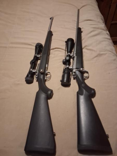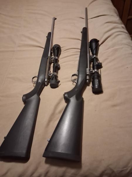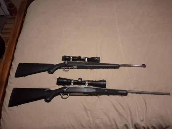 Ruger 77 stainless .44 magnum with 4x Nikon scope,Ruger bases and rings,3 magazines and Box.has had 6 rounds fired thru it to set scope.$1000.Ruger 77 matte Stainless.243 with 3x12x44 Vortex Scope,Ruger rings and bases.$1200 not really looking to trade but who no's.270-226-9315 Prices are firm but if you want both.