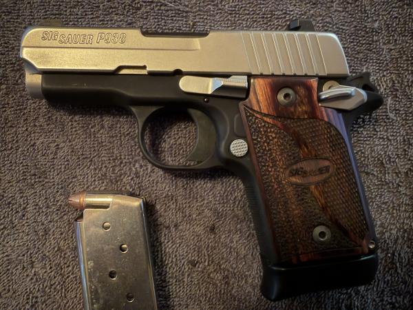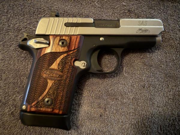 Sig Sauer P938 SAS edition 9mm.  Stainless 2 tone with wood grips.  This is a beautiful micro compact gun!  Comes with original gun case, extra mag and a Aliengear holster kit that be configured to wear in several different ways as well as an extra mag carrier.  This has been my EDC for several years and works excellent.  Approximately 300-400 rounds ran through this.  Any questions call or text (TEXT PREFERRED) (270)493-1743