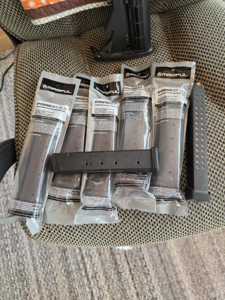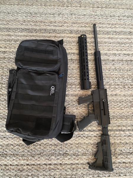 $750 for Rifle, both handguards and backpack and 1 magazine. Uses glock magazines. extra magazines are $20 each and $35 for the glock mag on right side of photo. This is a take down rifle with backpack that has plenty of room for extra ammo and mags. Awesome gun. I have fired it less than 200 rounds. Can be changed to use for left or right handed shooters and has threaded barrel for your extras. Also can swap handguards if you want to attach lights or lasers. Check them out on you tube. I also have bulk ammo for extra. I also have factory box it came with. 270three three 9 zero8zero5. Will trade for silver.