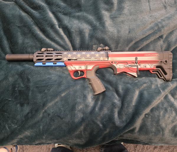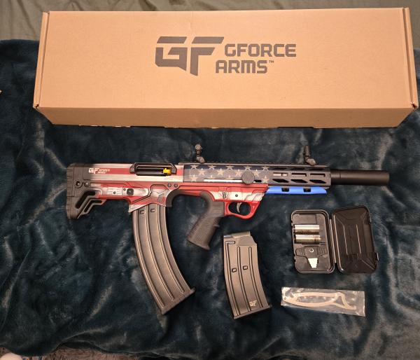 GForce Arms GFY-1 is a compact bullpup 12 Gauge semi-automatic shotgun built to preserve barrel length while minimizing overall footprint. With an 18.50-inch threaded barrel and a 28.50-inch overall length, the GFY-1 balances maneuverability with effective shot spread for close-quarters and home-defense oriented applications. It uses a gas-operated system and accepts AR-12 pattern magazines and drums, and comes finished in red white and blue with flip-up sights and top and bottom Picatinny rails for accessories. Five round and ten round mag. tools and chokes. It is like new only shot one box of ammo(20rd). $370. Feel free to call or text