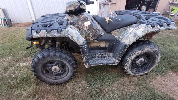Sportsman 550 on demand AWD runs good and rides smooth it is fuel injected think it has 1700 mi its been a good worker previous owner had top end redone it it pursuit camo and has a little fade on one side where it sat in lean-to it needs seat recovered lights and brakes work tires are ok but will need to be replaced in couple of years ive only used it on my property and hunting couple farms think its a 2012 model its cold collar when its cold and starting it please call two7zero978twofour67 thanks for looking and please no offers that are insulting if you're looking for something for nothing this ain't it tyvm