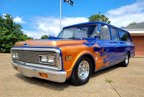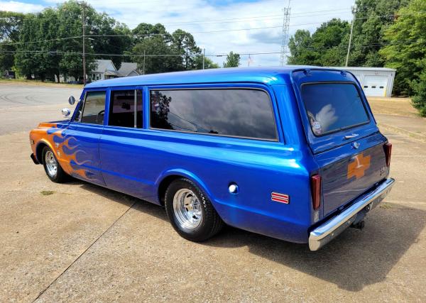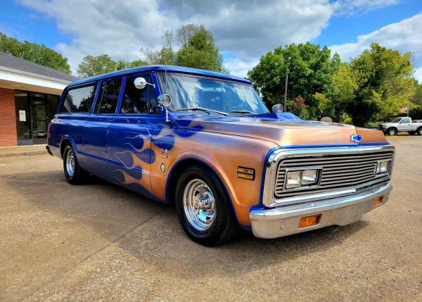 69 Chevrolet Suburban. It's an older 80's build with custom touches. The body and chassis are all original and very solid. It has remote door poppers, custom grill/ headlights and interior work. The hood was altered for a blower. All the glass is good. The rear gate and windows perform good as well. 350 along with a four-speed transmission. Posi rear end. Headers and dual exhaust sound great. Power steering ad power brakes. No a/c. Runs and shifts out great. The paint is old and has several places where the paint is chipped or scratched etc... It definitely looks better in the pictures. The interior is pretty darn nice for its age including the headliner. The body is however straight down the sides, and the floors are rock solid. The tires are brand new. It would be a big money ride with very little effort. These are getting harder to find. Very easy to also put back completely stock. New stinger hood scoop included. Call me with any questions. 731-796-4480. Thanks Danny