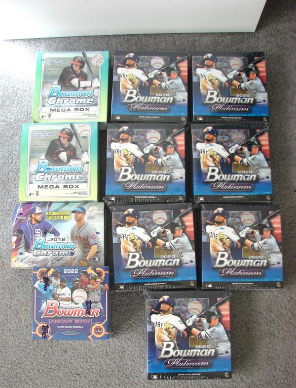 Trading Cards: Various vintage singles trading cards, rookies, patch, autos, 32-blaster box 2020-21 Upper Hockey series 2 New/Sealed, 6-2020-21 Upper Deck Hockey Series 2 Mega Box new/sealed,15-2020-21 Parkhurst Hockey Cards blaster box NEW FACTORY SEALED, 5-2019-20 Upper Deck Series 1 hockey new/sealed, 7-2019-20 Upper Deck Series 1 hockey blaster pack new/sealed, 28-2020-21 Upper Deck Hockey Series 2 hanger packs new/sealed, 2-2020-21 Upper Deck Hockey Series 1 hanger packets new/sealed, 2-2020-21 Upper Deck Hockey Series 2 tins new/sealed, 1-2020-21 Upper Deck Hockey Series 1 tin new/sealed, 19-2020-21 Upper Deck Hockey Series 1 mega box "Young Guns" new/sealed, 1-2020-2021 Upper Deck Hockey Series 1 blaster box “Young Guns” new/sealed, 3-2020-21 Upper Deck A13 Hockey Box Alexis Lafreniere Collection new/sealed, 20- 2021-22 Donruss Soccer FIFA Road To Qatar Jumbo Pack Pele Auto Kaboom RC's sealed, 9-2020-21 Panini Chronicles Premier League Soccer Factory Sealed Cello Pack, 2-2021 Panini Mosaic UEFA Euro 2020 Soccer Cards Mega Box sealed, 2-2021 Panini Mosaic UEFA Euro 2020 Soccer Cards blaster Box sealed, 5-new/sealed 2020-21 Premier League Panini Prizm Soccer Blaster Box,11-2021-22 Panini Donruss MLS Soccer Blaster Box 11 Packs 88 Cards Factory Sealed,12-Topps 2021 MLS Major League Soccer Blaster Box sealed, 6-2020 Topps Team USA Olympics Team Hopefuls Blaster Box Sealed, 5-2020 Topps Team USA Olympics Team Hopefuls packs Sealed,11-brand new/sealed 2021 Panini Prizm UFC Debut Edition Blaster Box,1-2021 Topps Chrome WWE Blaster Box! Brand New Factory Sealed,1-2021 Championship Collection Football MEGA Box- sealed, 19-Football Collector’s Edge NFL Hanger Box-new/sealed, 7-2021 Leaf Draft Football Blaster Box, 2-Panini Score 2021 NFL Football Blaster Box sealed, 1-2022 Panini Score Football Blaster Box new,1-New 2021 Panini Prizm, NFL Football-Blaster Box new, 1-2021 Panini Prestige Blaster Box NFL Football Cards factory sealed, 1-2021 Sage Hit Premier Draft High Series Football Blaster Box sealed, 1-2021 Sage Premier Draft Blaster Box Factory Sealed, 1-2019 Panini Score Football Blaster Box - New & Factory Sealed, 1-2020 Panini Contenders NFL Football Factory Sealed Blaster Box, 5-2021 Panini Mosaic NFL Football Hanger Box – new, 5-2021 Panini Score Football Hanger Box NFL New, 11-Panini Chronicles Draft Picks NFL 2021 blaster Box new, 9-2021 Panini Contenders Draft Picks College Football, 6-2021 Panini Contenders NFL Football Blaster Box - Factory Sealed, 3-2021 Panini Contenders Football Hanger Box-Factory Sealed, 6-Panini Prizm Draft Picks 2021 Collegiate Football Mega Box, 7-2021 Panini Prizm Draft Picks Football Blaster Box Factory Sealed, 5-2021 Panini Chronicles NFL Draft Picks Football Mega Box Sealed, 1-Panini Chronicles Draft Picks 2021 Collegiate Football Hobby Box, 1-2021 Panini Donruss NFL Football Blaster Box, 1-2020 Panini Absolute Football Pack, 3-2020 Leaf Draft Football Pack, 2-1991 upper deck NFL Football high series packs, 2-1991 score series 1 NFL Football packs, 44-2021 Panini Donruss football packs, 5-2021 Panini Donruss NFL Football value packs sealed, 13-2021 Panini PRIZM Draft Picks Collegiate Football Cello Multi Pack-Sealed, 16-2021 Panini Score NFL Football 40 Card Value Pack Brand New Sealed, 9-2021 Panini Chronicles Draft Picks football packs, 4-Lot Of 8 2021 Panini Absolute NFL Football Pack-5 Cards-Factory Sealed, 2-2016 Panini collegiate draft Prizm Picks packs, 21-2022 Panini Prestige Football Pack- Factory Sealed, 8-2021 Panini Mosaic NFL Football Cello Pack Brand New Factory Sealed,10-Panini Chronicles Football 2020 Cello Value Pack NFL New Sealed, 20-2021 Panini Illusions NFL Trading Cards 20-Card Value/Fat Pack factory sealed, 86-packs 2021 Panini Absolute Football, 1-2021 Panini Illusions NFL Trading Cards Value / Fat Pack factory sealed, 4-2020-21 Panini NBA Hoops basketball Winter Holiday Blaster Box-sealed, 6-2021-22 Panini Contenders Basketball Blaster Box factory sealed, 2-Panini 2021 Donruss Optic Blaster Box-new, 2-2020-21 Panini Prizm Draft Picks NBA Basketball Blaster Box, 3-2020-21 Panini NBA Sticker & Card Collection Box brand new, 1-Panini Donruss 2020-21 National Basketball Association Blaster Box, 4-Panini Donruss 2020-21 National Basketball Association Blaster Box, 1-2019-20 Panini Clearly Donruss Basketball Hobby Box, 1-2019-2020 Panini Mosaic Basketball Blaster Box factory sealed, 1-2019 Panini Contenders Draft Picks Basketball Blaster Box new/sealed, 1-2019-20 Panini Prizm Basketball Blaster Box, 1-2020 Panini Contenders draft picks basketball new, 8-Panini Contenders 2020-21 NBA Blaster Box, 19-2019 Panini Prizm Collegiate Basketball Blaster Box,19-2020-21 Panini Mosaic NBA Basketball Hanger Box 20 New Factory Sealed, 22-2020-21 Panini Donruss Basketball Fat Pack Value Cello sealed, 3-2020-21 Panini Contenders NBA Basketball Cello Value Pack, 7-2020-21 Panini Mosaic NBA Basketball Cello Pack brand new/sealed, 7-TOPPS 2020 Bowman Platinum Mega Box MLB Baseball Cards, sealed, 2-2020 Bowman Chrome Baseball Mega Box, 1-2022 Bowman Baseball Mega Box Factory sealed/new, 1-2019 Bowman Chrome Baseball hobby box sealed, 10-2021 Bowman Chrome Baseball Mega Box - factory sealed, 1-2021 Bowman Chrome Baseball Hobby Box, 1-MLB Baseball - 2021 Topps Bowman Chrome Hobby Trading Cards Mini-Box sealed, 3-2021 Panini Donruss Baseball Cards Hanger Boxes factory sealed, 6-2021 Panini Donruss Baseball Cards blaster Boxes factory sealed, 4-Panini MLB 2021 Chronicles Baseball mega boxes, 1-2021 Panini Chronicles Baseball Hobby box sealed, 1-2021 Panini Mosaic MLB Baseball Sports Trading Cards Mega Box, 1-Topps Stadium Club 2021 MLB Blaster Box, 3-Topps Series 1 2021 Baseball blaster box, 1-2021 Topps Series 1 Baseball mega box, 2-2021 Topps Series 1 baseball hanger, 2-2021 Topps Series 2 Baseball blaster box new, 1-2021 Topps Series 2 Baseball hanger box new, 5-2021 Topps Update Series Baseball hanger box new, 8-Fairfield Baseball Collector