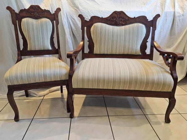 Victorian Parlor Set 19th Century Carved Mahogany Frame Chair and Loveseat w/ Striped Upholstery. Excellent Condition, Delivery Considered based on distance.