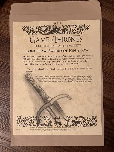 GOT Longclaw Sword of Jon Snow w/Certificate & Plaque