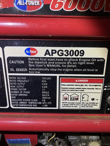 All Power 6000W generator 120v/240v