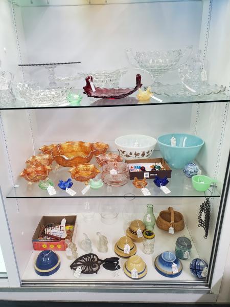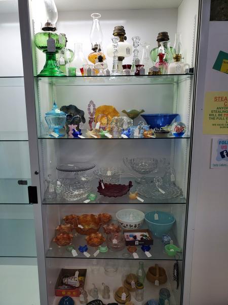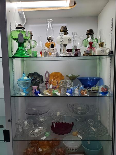 | All items inside TWIN LAKES ANTIQUE MALL in Gilbertsville, KY. Many, many things that you just don`t see these days anywhere. In Showcase "U" You can call 270-362-2218 if you want to see if something is still available. JUST TOOK IN 11/9/2025 Pink, Cobalt Blue, Green Hen on Nest Salts $12.00 each Jadeite Hen on Nest Salts $13.50 each Blue Slag Swirl Hen on Nest Salts $14.50 each Clear/Amberish Slag Swirl Hen on Nest Salts $14.50 each Box of "Blue Grass" items, string tags, stickers, pencil, many items, $12.50 for whole box Fostoria, American Pattern: Center Handle Server $16.75 Medium Size Oval Bowl $7.50 Centerpiece Bowl, also is base for punch bowl $25 Clear Candlewick, large size cake stand $35 Clear, Fenton, Duck figure, marked Fenton $19 Art Glass, 10 pieces of glass Candy, $22.50 for all Pink Depression Glass, Adam pattern, candy dish with lid $45 Child size, cast iron, Flat Iron, $18 (3) Glass, Rabbit shaped candy containers, 2 styles, $15 each Emerald Green, Early #2 Oil Lamp, Bowl has glass threads, screws into the base, base has flowers in a band around it, bowl is sort of a melon rib, Very Nice & Hard to Find Lamp $99 Pair of tall Clear glass Candlesticks, very pretty $15pr Fostoria American pattern: Large, stemmed, 2 handle Trophy Bowl $45 Crab meat bowl with insert $18 Cruet with original stopper $18.50 Cheese Stand $15 Clear glass, Punch Bowl Ladle, has pouring spout on 2 sides, $22.50 Jadeite 1/2 Cup Measure $18. Fire King, Delphite blue color, Large Mixing Bowl, $49. EAPG Toothpick holder $8 Early Cast Iron Trivit $6 Milk Glass, Log Cabin, finger lamp, looks like it has never been used, Scarce lamp $55. Blue, Mayfair or Open Rose pattern, Depression Glass, Candy Dish with top, this is a fantastic item, $129., compare at Replacements LTD. website, their price is $359.99 Clear, Standing elephant with lift off top, nice $27.50 Pyrex Americana Bowl - large size $28 White Moonstone, Aladdin, Diamond Quilt pattern Lamp with nice burner, this is a super condition lamp, doesn`t appear to have been used much, if any $225 Oil lamp chimneys, #1 size, #2 size, all old ones, plain ones, decorated ones, beaded tops, ruffled tops, etc. Bohemian ruby cut to clear toothpick holder $19 EAPG Green/Opal Diamond Spearhead toothpick holder $19 Murano Smokey pink color toothpick holder, has Murano label on bottom $19 Pink Mayfair or Open Rose, Shot Glass, this is an old one, Extremely RARE $49 Donald Duck clear glass Mustard Bank with ORIGINAL Lid, lids are impossible to find $22.50 Antique Carnival Glass, Northwood, Marigold color, GOOD LUCK ruffled Bowl, Super Pretty $45 Cambridge Caprice, Moonlight Blue color ftd salt or nut dishes, 4 - $15 all Cambridge Caprice, Yellow ftd. salt or nut dishes, 3 - $9 all Aladdin lamp Model B, gallery for burner, super nice, old one $20 Blue Ball, 1/2 pint jar with lid $22.50 Antique, Fenton, Carnival Glass, Marigold color, Panther w/Butterfly & Berry pattern, large 3 ball/claw footed bowl and 6 matching small bowls, all are super dark, Gorgeous iridescence and all matches very well, color wise, $125 for 7 pc set Antique Carnival Glass, Zippered Loop #1 Oil lamp with burner and chimney, smallest size of this pattern lamp, a Beauty $145. Small Firkin, with lid - Cute as can be $25. Cranberry flash, Cruet with stopper - $16 Ruby Flash, EAPG, Kings Crown Toothpick holder - $10 Cobalt Blue, Royal Lace, 3 footed Centerpiece bowl $39 Antique, Pot Scrubber $10. Fostoria, American pattern, RUBY RED color, 2 handled plate with turned up sides, $49. Antique, Carnival Glass, Northwood, Aqua-Opalescent color, Hearts & Flowers Compote, Super Pretty - $125. More antique glass, stoneware, lamps, graniteware, paperweights, oil lamp chimneys, etc. in the showcase, see pictures below. |