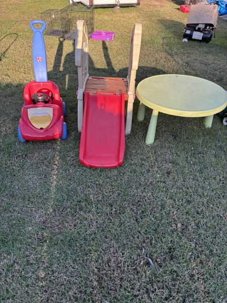 | these are in good condition!! slide with rock climing wall $40, push car $30, table has one leg missing $15!! CASH IS KING!!! WILL TAKE REASONABLE OFFERS!!! 270=556-9728!!! |