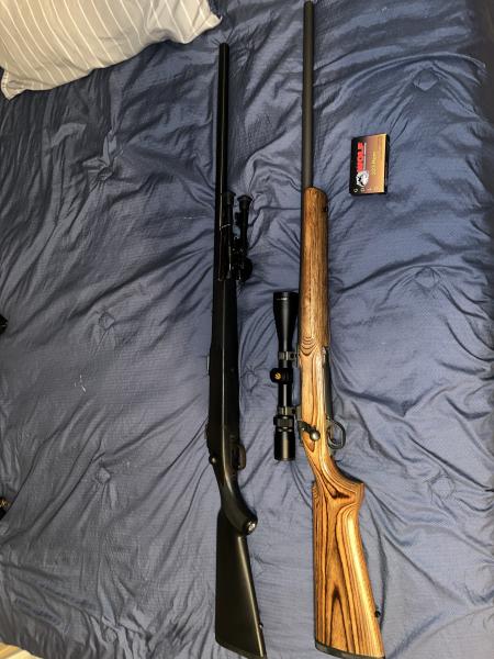 1st Savage Model 112 .223 Bull Barrel___$700 Ruger M77 Mark II .223 Bull Barrel___$1100 (Nikon 3-9x40)(26in Stainless Barrel) 2nd Bergara BMR .22lr___$600 (Vortex Diamondback 2-7x35 $350 new) $500 w/o scope 3rd Tristan Cobra II .410 Pump___$300 (Carlson Turkey Choke) $480 w 5 boxes of 3” tss .410 tss 3”___$40/box (5 available) .223 wolf gold fmj___$8/box (60 available) 12 gauge tss 3.5”___$70 (1 available) 731-335-6373 |
