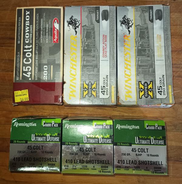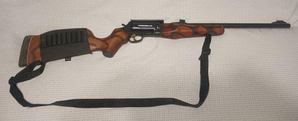 Rossi Circuit Judge 410/45LC. 18.5" barrel. Will shoot 2.5" and 3" shells. The walnut stock. Has a fiber optic front sight. Comes with 3 boxes of factory 45lc ammo and 3 boxes of Winchester self defense 45lc/410 ammo. |