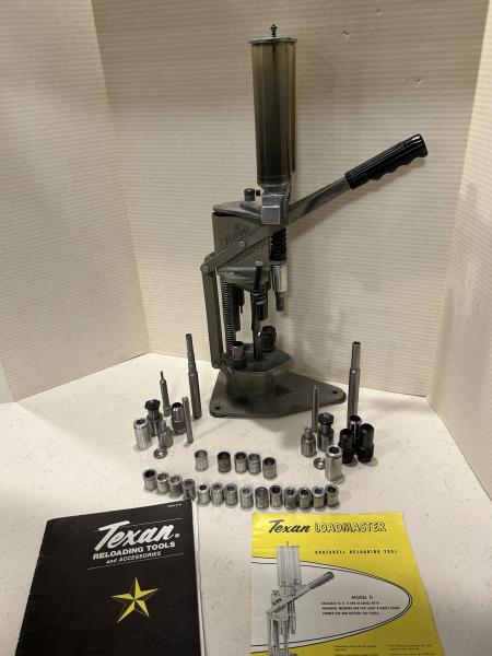Texan Model D Loader with two extra Die Sets. It will load 12 gauge 2¾” and 3” shells. With the 20 gauge Die Set it will load 2¾” and 3” shells. With the last Die Set it will load 28 gauge 2¾ shells. Some of the parts of the die sets I bought and being a home machinist I made the other parts. All three gauges load perfect shells. As you can see in the picture there are a good selection of shot and powder bushings. Charts are included for how much powder or shot each bushing will drop. I have used this loader for many years and it has served me well, as I’m sure it will serve you well.. Price is $250 Text with questions : 27o 2o5 863four |