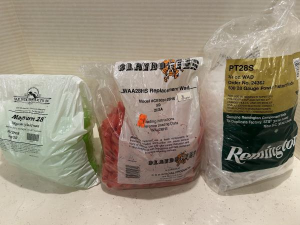28 gauge wads. Three different brands. The Remington bag is full, #250 The Ballistic Products bag has approximately #175. The Claybuster bag is full, #500 Price for all 3 bags is $24 For questions, call or text: 27o 2o5 863Four |